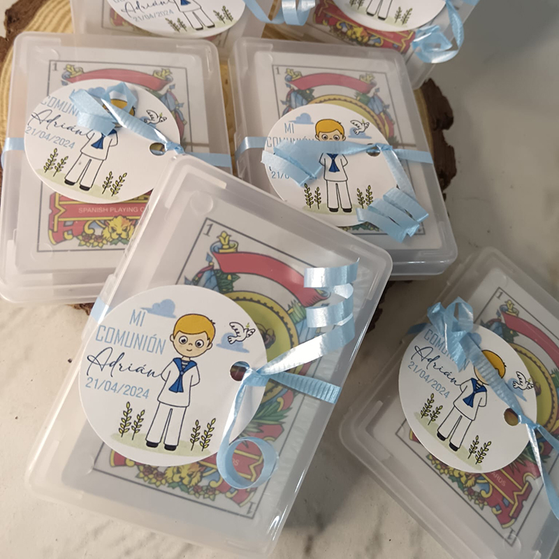 Incluye baraja de cartas presentadas en bolsita de celofán con lazo y tarjeta personalizada a tu gusto.