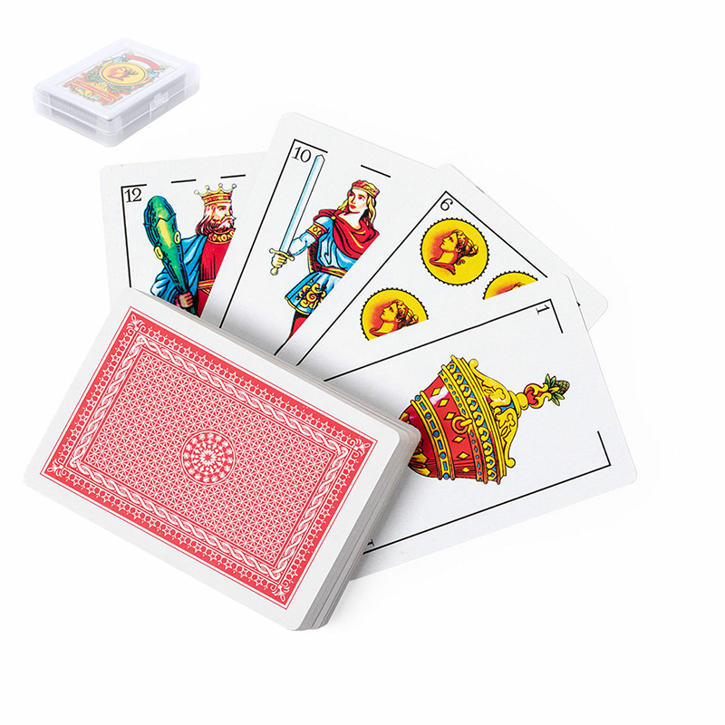 – Baraja española: Baraja española fabricada en resistente papel laminado. Incluye 50 naipes, presentados en estuche individual de acabado translúcido y con cierre de seguridad.