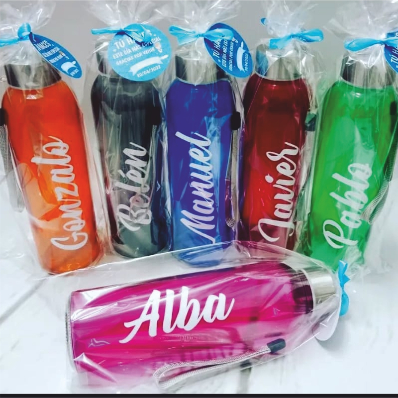 Incluye bidón de cristal personalizo ,presentado en bolsa ,lazo y tarjeta a tu gusto .