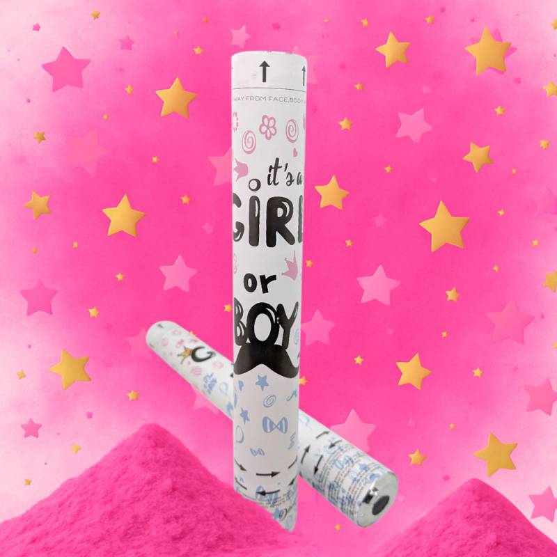 Cañon de confeti de 40 cm ROSA, se envían anónimo nadie sabrá el SEXO. En la parte de debajo hay una pegatina negra qué hay qué levantar para ver el color del cañón.