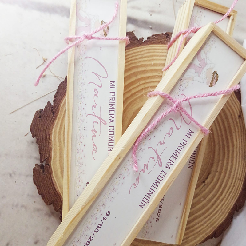Incluye mikado de madera personalizado a tu gusto y presentado con lazo y tarjetita.