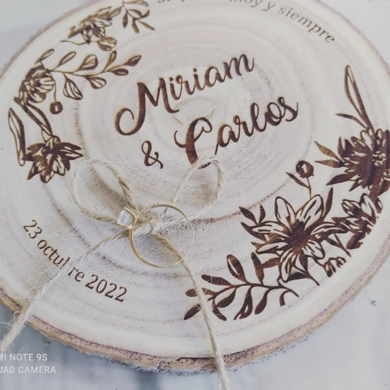 Cada pieza está elaborada con madera natural, grabada con los nombres de los novios, la fecha de la boda o un diseño especial, y puede incluir cinta, cuerda o lazo para sujetar las alianzas con elegancia.